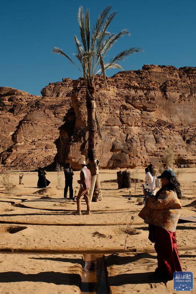 ↑1月15日,在沙特阿拉伯欧拉,人们在“沙漠未知数·欧拉”国际艺术展媒体预展上参观。