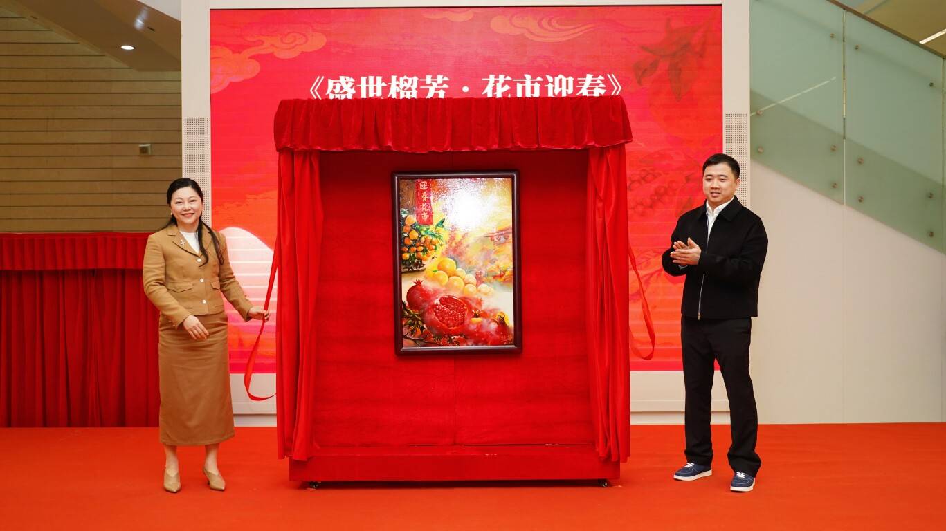 作为《盛世榴芳》系列全新力作,本次发布的6幅《迎春颂》作品紧扣“新春纳福·民族团结”核心主题,将象征中华民族团结一心、繁荣昌盛的石榴元素,与醒狮、花市、骑楼、潮汕工夫茶等岭南文化标志性符号创造性融合,生动勾勒出鲜活灵动的岭南新春图景。创作者袁桂扬以西方油画写实肌理融合中国传统写意意境,巧用朱红、明黄等暖色调铺陈光影,既彰显岭南文化务实兼容、开放包容的精神特质,更传递出中华民族多元一体、喜迎新春的美好愿景,让中华优秀传统文化在笔墨间焕发时代生机。中国美术家协会主席范迪安曾盛赞其作品“画出丰盛”,这份丰盛既源于画面意象的饱满鲜活,更来自艺术与公益双向奔赴的温暖力量。活动现场同步推出基于6幅作品打造的专属红包封面,面向广大市民免费开放领用,让民族团结的美好寓意与岭南新春的艺术雅韵,随新春祝福走进千家万户。