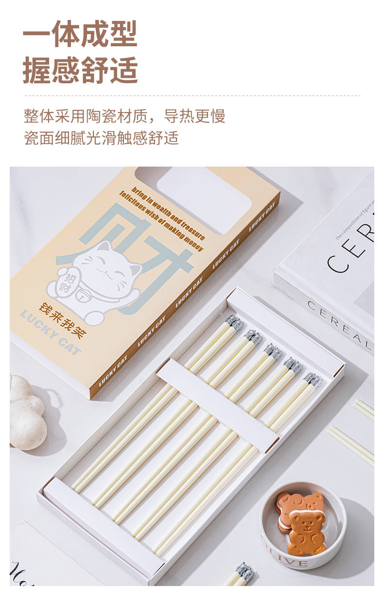今喜家高档陶瓷筷具有诸多显著特点。在设计方面,品牌深耕原创,每款设计均独具风格,且拥有版权与专利。以简约轻奢为核心开发方向,融合现代美学打造金属衔接款式,造型简约大方,契合当下审美。无论是日常家用,还是作为礼品馈赠,都能尽显雅致品质与用心。在工艺上,采用一体高温烧制技术,历经严苛温控流程。筷尖经过圆润打磨,不伤唇,握在手里不打滑、不硌嘴,老人孩子使用也十分舒心。而且其硬度远超普通瓷筷,日常磕碰不易崩裂,使用寿命更长,有效减少了频繁更换带来的资源浪费。此外,其釉面熔点达900℃,耐高温性能卓越,可直接适配高温消毒、洗碗机、消毒柜等场景,接触火锅、热汤等滚烫食物不变形、不释放有害物质,解决了普通筷子怕高温、易变质的难题。