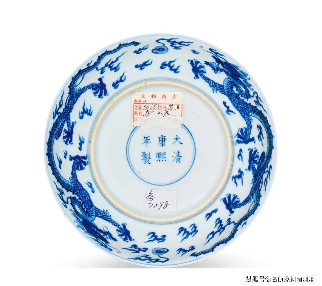 盘心及外壁均先以釉下青花勾绘图案,再施绿彩填色,绘成斗彩戏珠龙纹图,蓝、绿二色清新秀雅,所绘龙纹身姿矫健,底部双圈内青花书“大清康熙年製”六字双行楷书款,为康熙一朝宫廷瓷艺之典范。