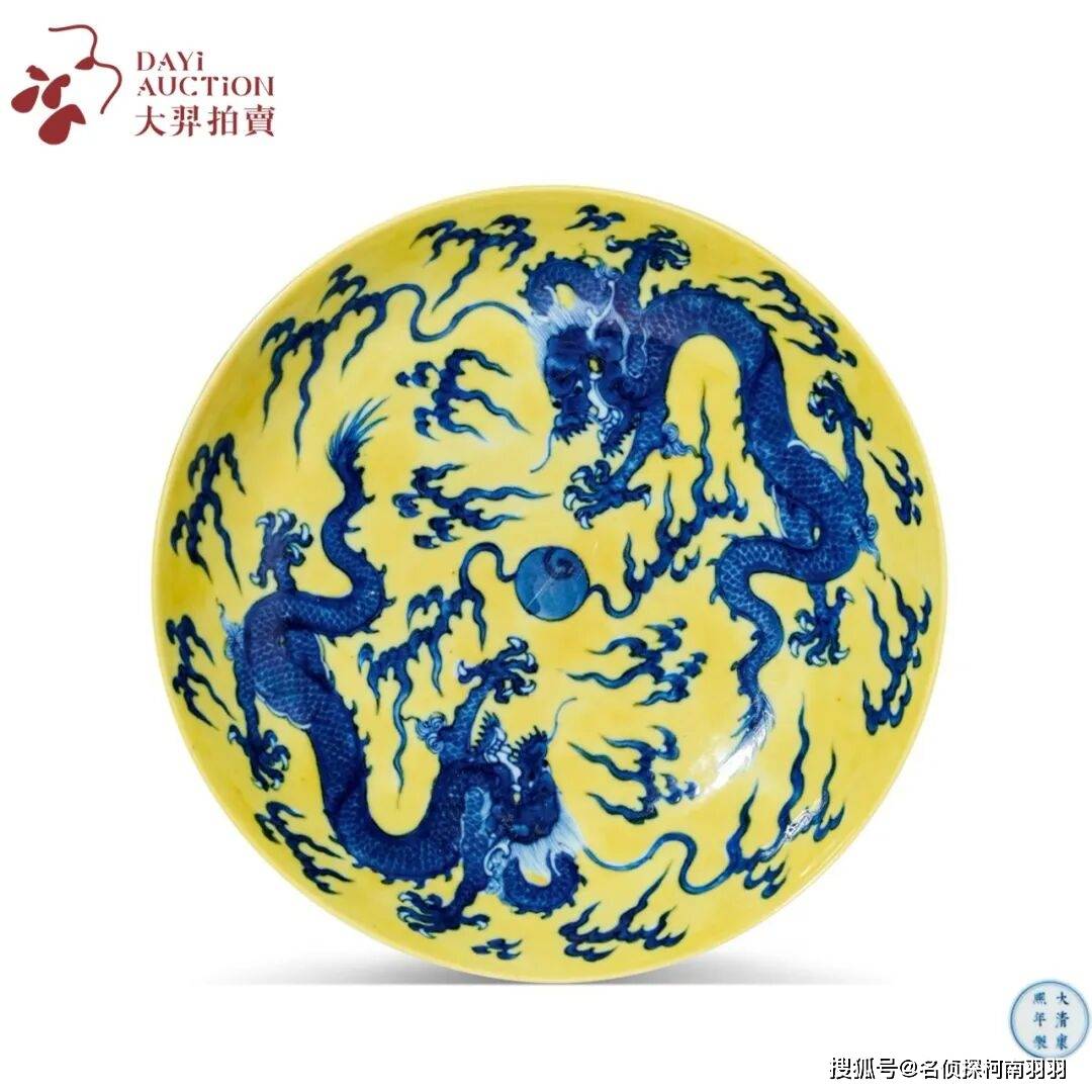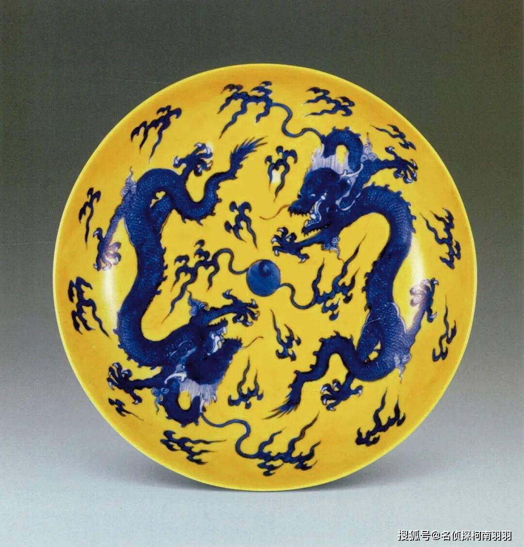 附图:北京故宫博物院藏 清康熙 黄地青花双龙戏珠纹盘