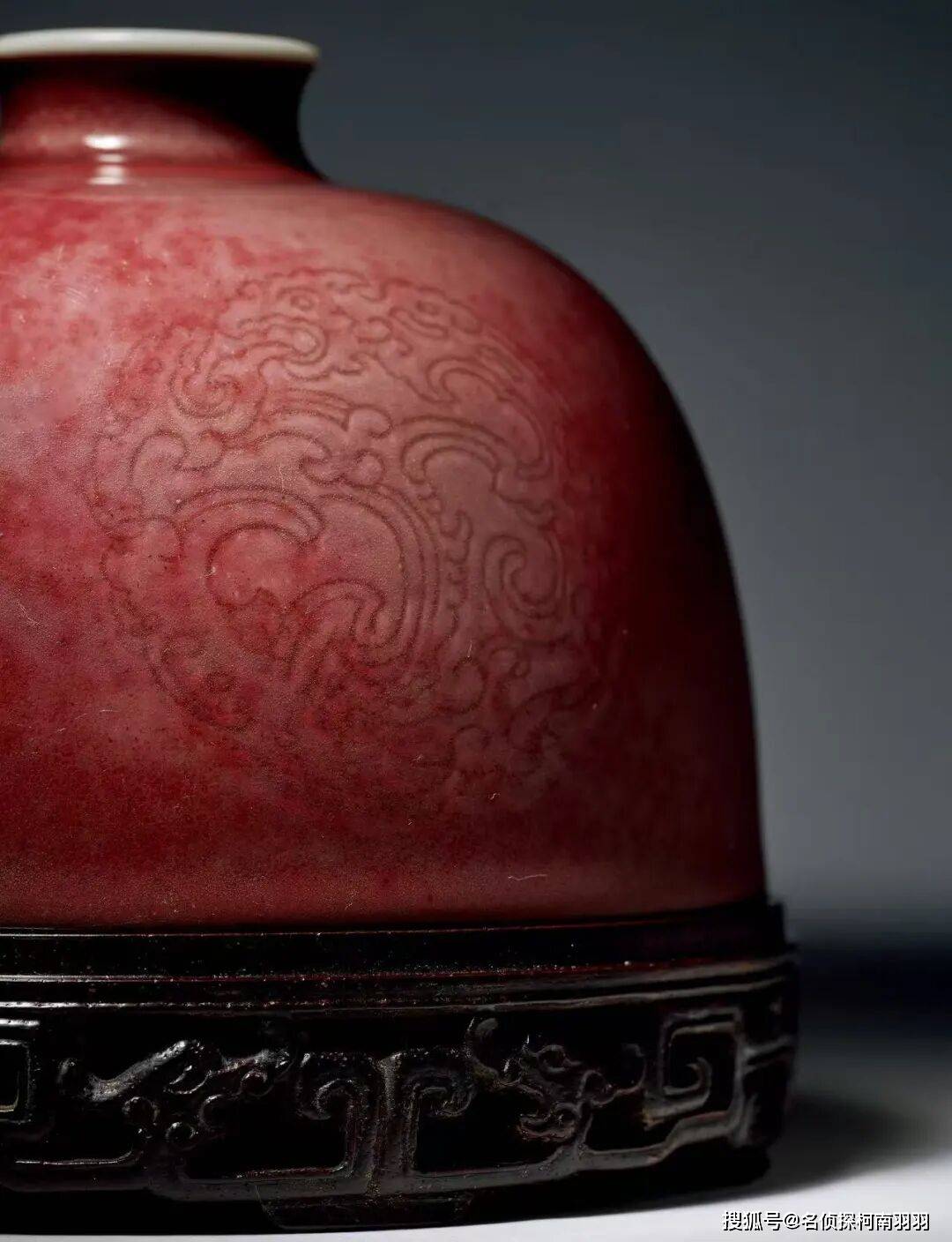 拍品与故宫博物院和南京博物院藏品品种相同,造型端庄优美,胎质细润致密,釉下暗刻团螭纹,外壁满施豇豆红釉,釉色深沉雅静。