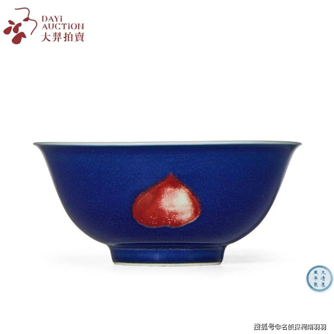 本品敞口,弧腹,圈足。器型巧致,胎体轻薄,通体施霁蓝釉,釉色均匀明快;霁蓝釉内以釉里红绘石榴、寿桃、柿子组成之三果纹饰,秞里红色彩纯正,呈色鲜艳,三果造型逼真,果实红白相映的深浅变化,宛若写生实物。瑞果又寓有「多子」、「多福」、「多寿」吉祥寓意。