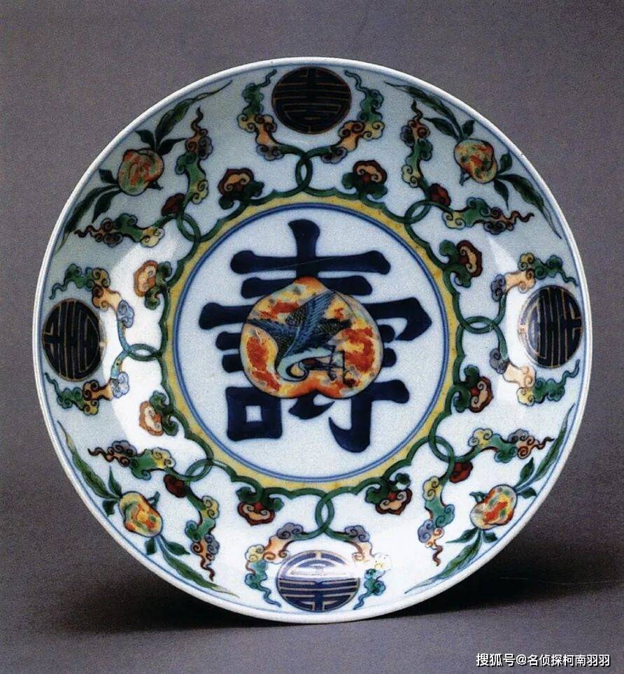 此盘侈口弧腹,下承圈足,胎质白皙坚实,白釉清亮莹润。整器以斗彩手法装饰,盘心绘画分三层,以青花“寿”字为底,再以浅色绘製寿桃,寿桃内部一只仙鹤飞舞,环环相扣,主题明确,用极具创新的手法将仙鹤献寿这一传统题材表现的淋漓尽致。