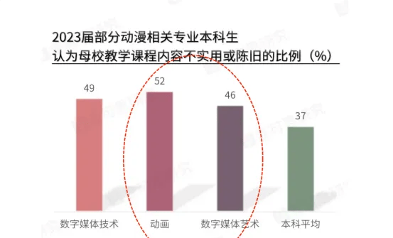 从毕业生对母校教学评价上看,两个专业反馈认为“课程内容不实用或陈旧”的比例也接近半数,动画、数字媒体艺术专业该比例分别为52%、46%,明显高于本科平均水平(37%)。