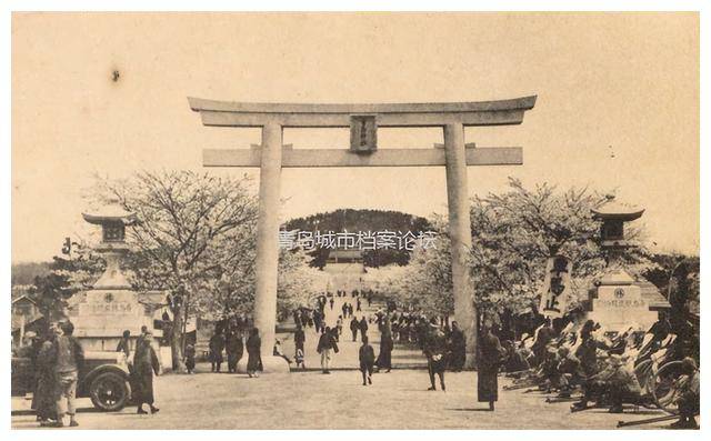 在另一张照片中,青岛神社的全景展现了日本占领时期的强势痕迹。日本第一次占领青岛后,将“贮水山”改名为“若鹤山”,并于1915年在山北坡修建了青岛神社,这座神社曾是日本海外最大的神社。其雄伟的山门“鸟居”宽达10米,高达15米,门内悬挂着“青岛神社”四个大字,象征着日本对这片土地的统治与对当地文化的侵蚀。