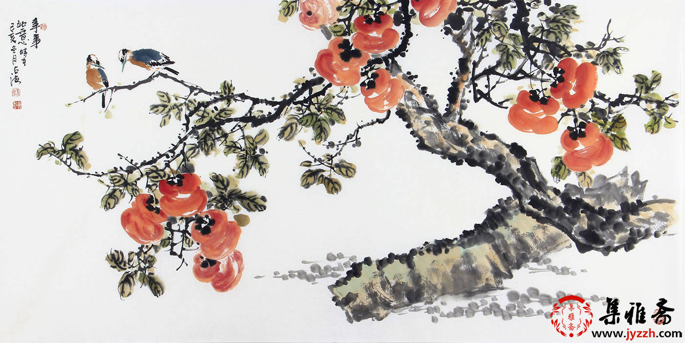 此幅《事事如意》是名家王占海的精品花鸟画,构图巧妙、虚实相间,充满神韵与生机!画面中个个红彤彤、圆润饱满的柿子挂满枝头,仿佛能嗅到硕果的清甜香气,硕果累累的景象象征着丰收与富足;两只灵动的鸟儿驻足枝头,为画面增添了和谐动感,更显鲜活有趣。柿与 “事” 同音,柿子红润似火、果实饱满,寓意充足富裕、事事顺心,整幅作品洋溢着丰收吉祥、吉利喜庆的氛围,是一幅兼具观赏价值与风水寓意的吉祥花鸟画。
