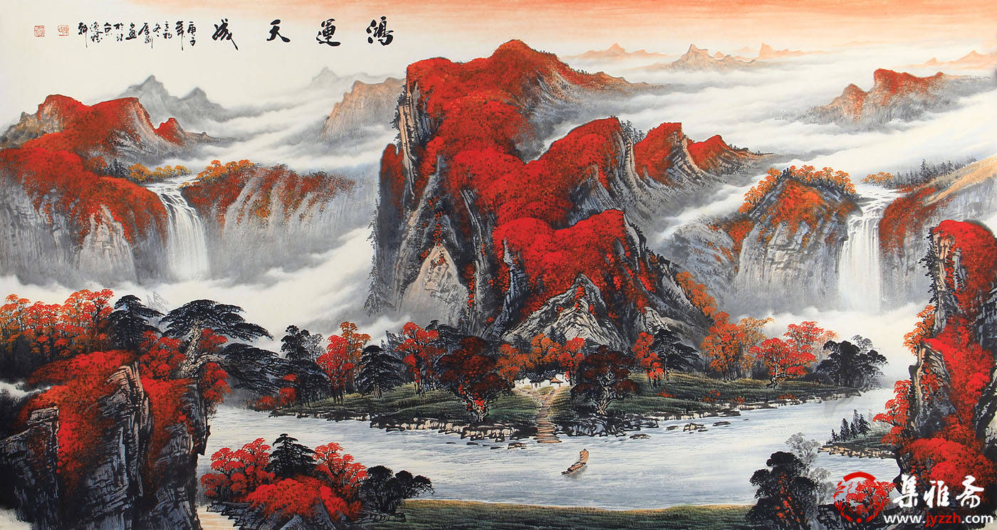 《鸿运天成》是名家蒋伟的精品山水画,画作将传统国画山水的精髓与中国红色山水画的历史特性完美融合,构图巧妙、虚实相生、远近呼应、疏密有致,外显气魄雄伟恢弘,内敛精神禅意悠远,境界超迈、气象宏远,尽显大家风范。作品笔法精湛,粗细兼工、对比强烈,色彩鲜明夺目,主题以群山绵延无尽为背景,大面积采用朱砂点染,象征家人鸿运当头、运势如虹;满山红叶与秋之金火辉映山间,碧树描金、华彩辉煌、枝繁叶茂,寓意坐地生财、财源广进;宝山碧树环拥三泉河流,俨然一个金光碧火的 “聚宝盆”,风水寓意极佳。