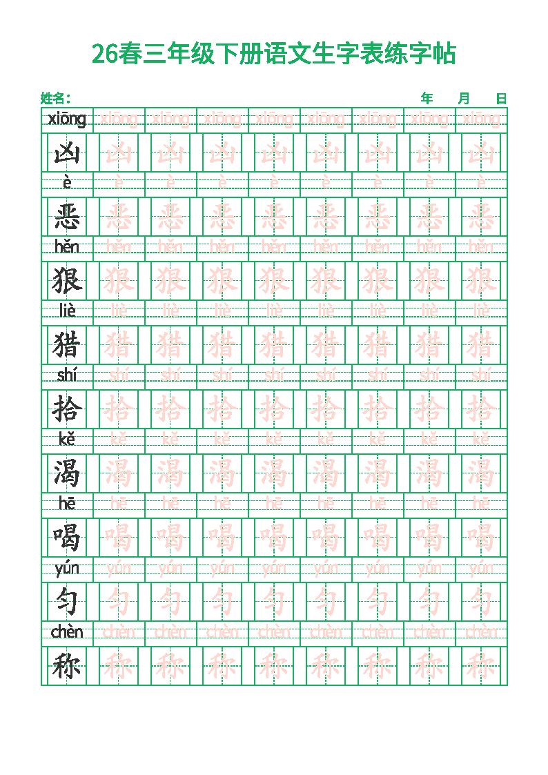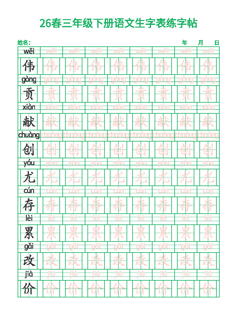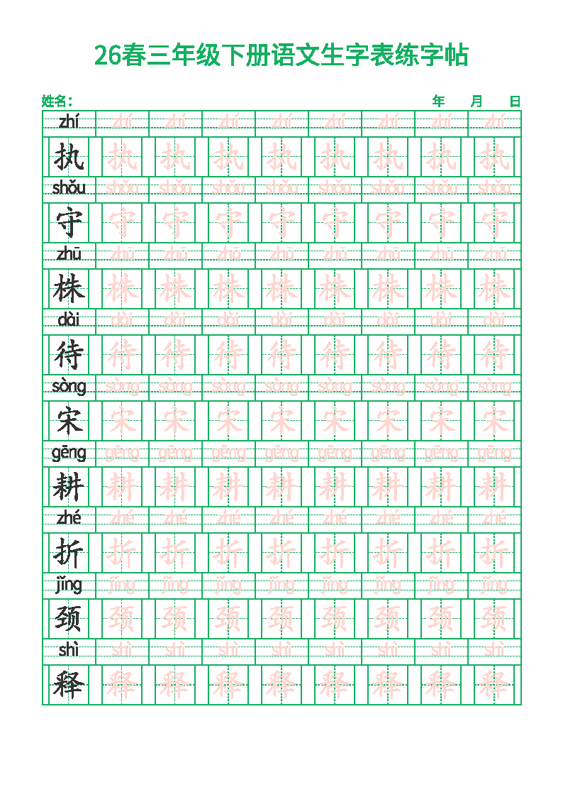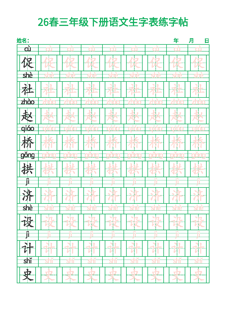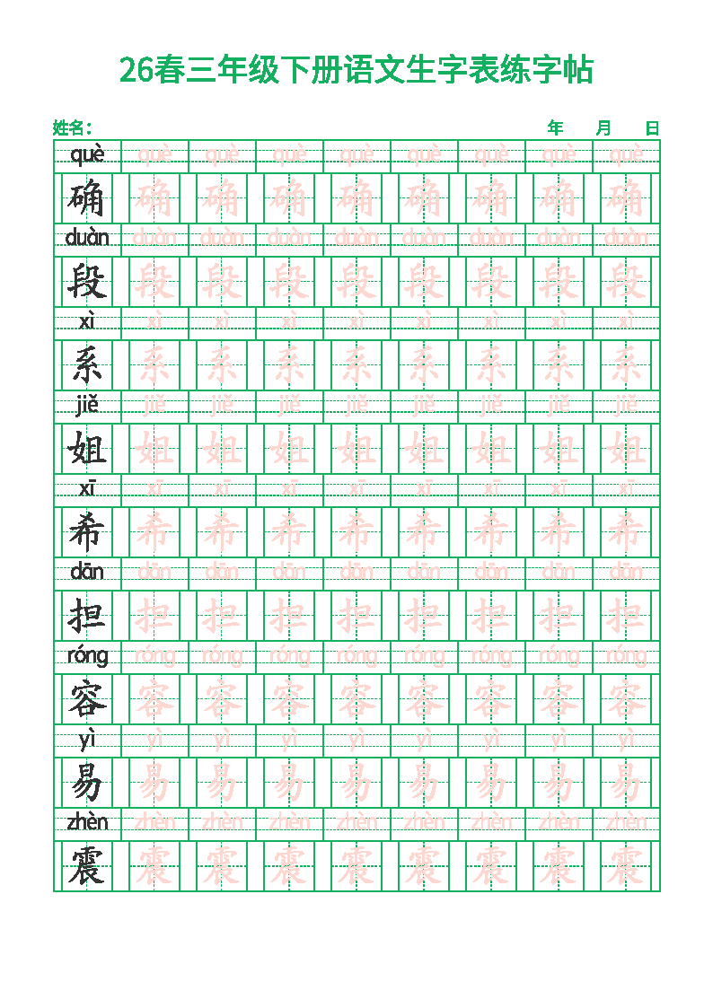 2026 春三年级下册语文生字表描红字帖,同步部编版教材全册生字,带拼音笔顺部首组词,田字格描红 + 临摹双模式,帮孩子规范书写、夯实生字基础!