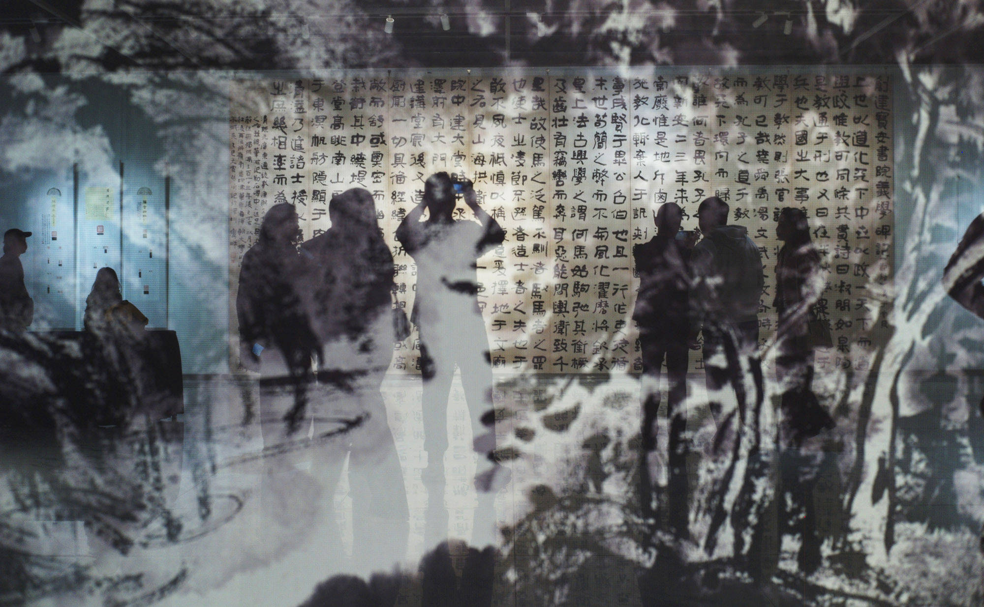 步入展厅,一件垂坠的半透明网格布帘率先吸引观众目光。帘上印着山水画作与题画诗,透过薄帘,后方墙上的巨幅书法作品隐约可见,那是张琦录写的清康熙《新安县志》中关于“宝安书院”的记载,古今文化在此悄然呼应。
