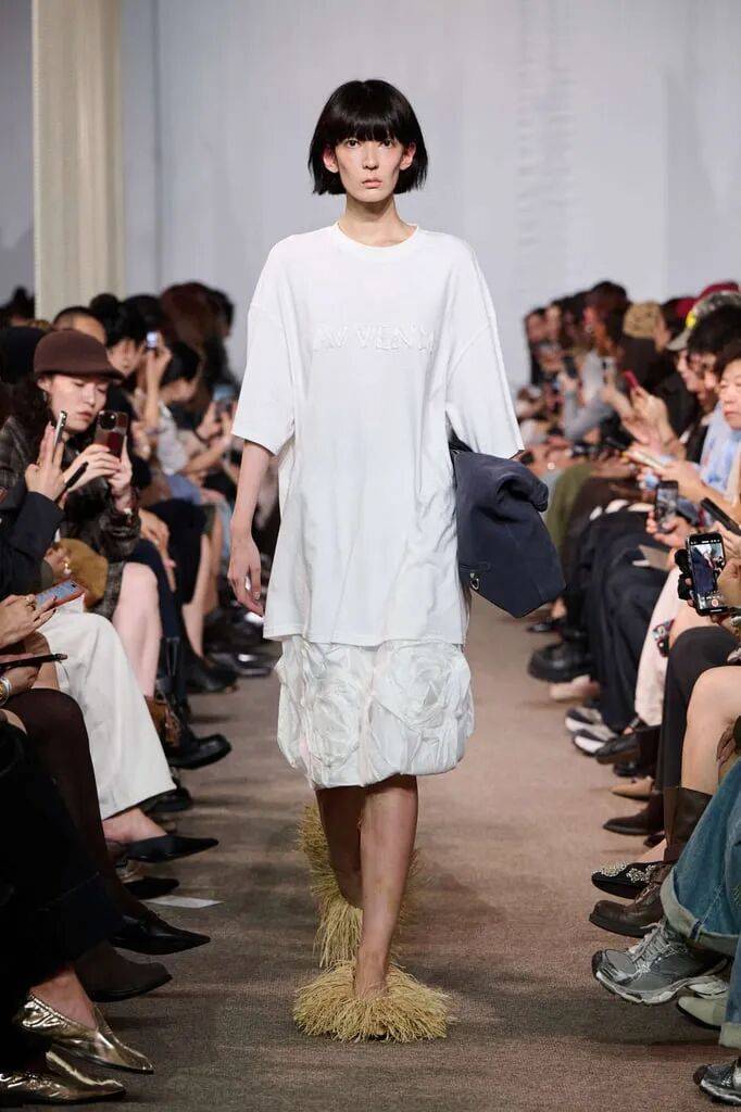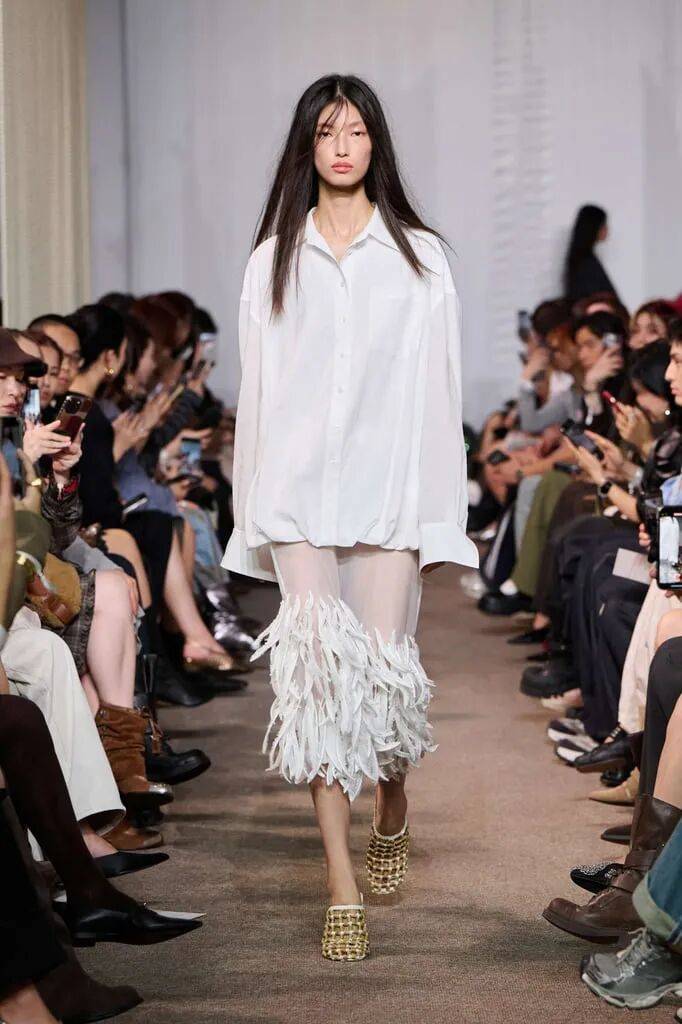 白色的上衣在廓形线条中,相同颜色的低调大方,在下装的轻薄质感和流苏的纹理等设计的结合,则让下装有着更多的设计感。