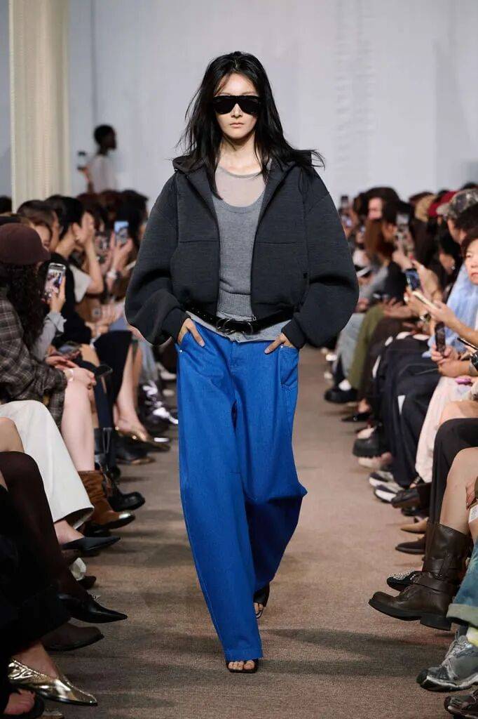 灰色的休闲内搭在领口的位置,轻薄材质的出现也多了一些朦胧视觉,而黑色的休闲外套在视觉对比中也更多了对比的层次感,而蓝色的宽松直筒裤也多了利落气质。