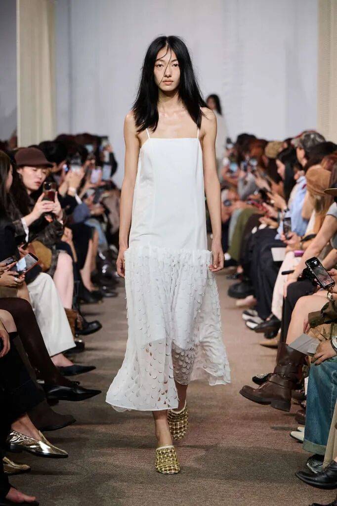 白色的吊带裙装在宽松廓形的直线线条中,以镂空花纹的裙摆进行结合,则让裙装也多了一些造型细节的设计感。