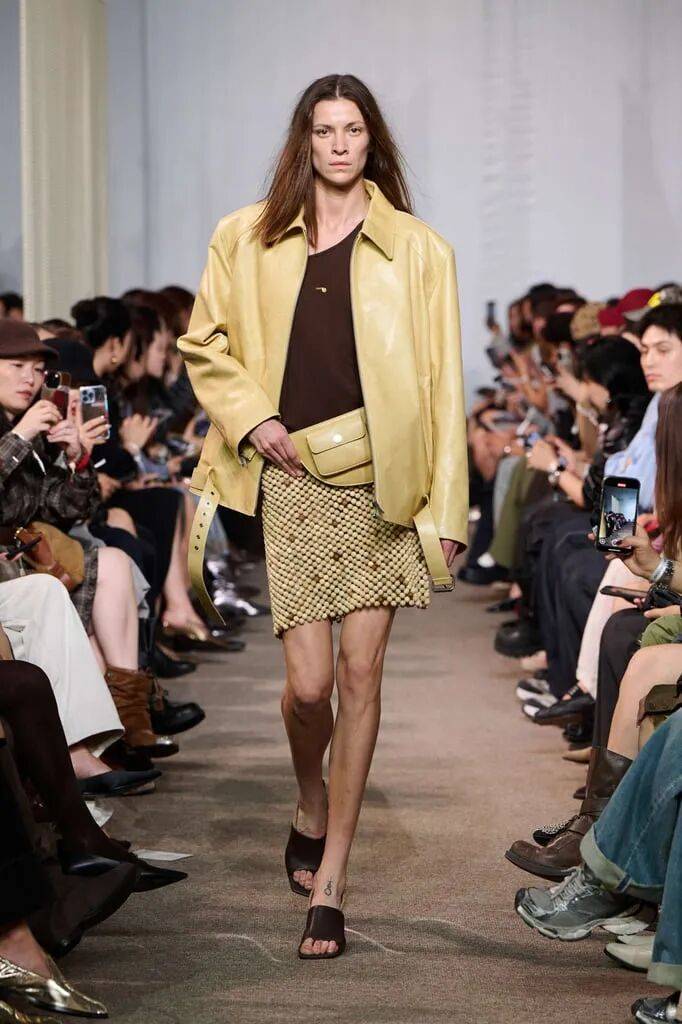石灰绿色的夹克外套在廓形线条的随性休闲中,以光滑的皮革等材质的面料增加了纹理质感,和内搭的搭配在质感的对比中更多了一些层次时尚。