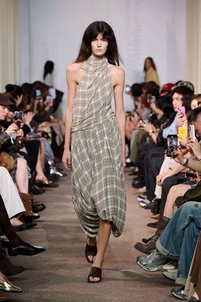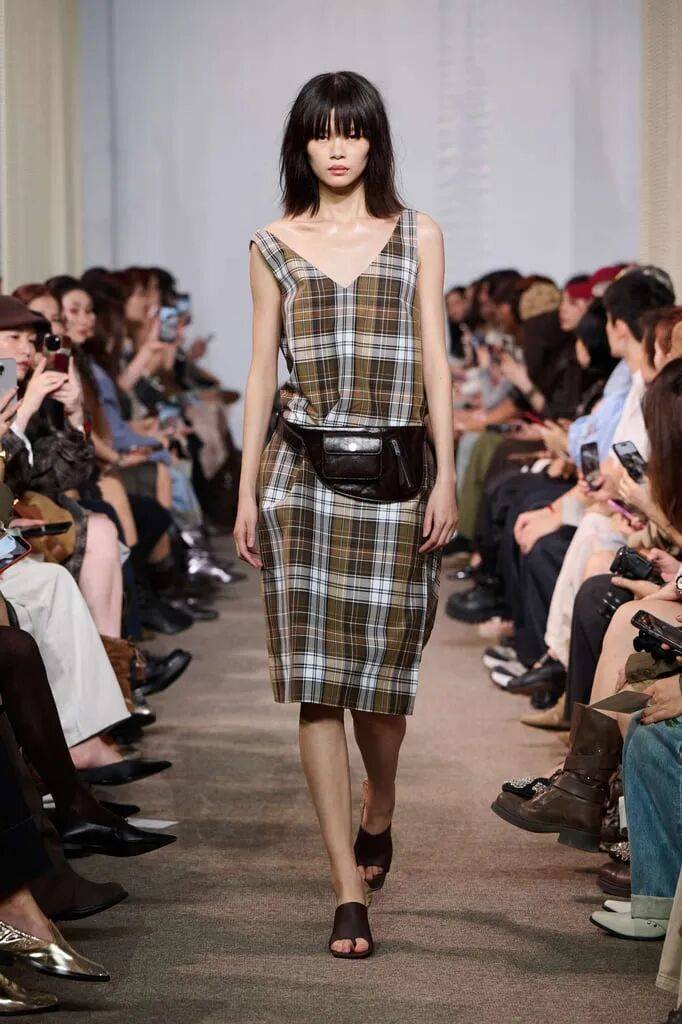 无袖的吊带背心裙在棕色系等颜色的结合,色彩的对比则多了一些格纹图案的经典复古的气质,在皮革腰包的搭配,则让格纹裙装多了一些细节亮点。