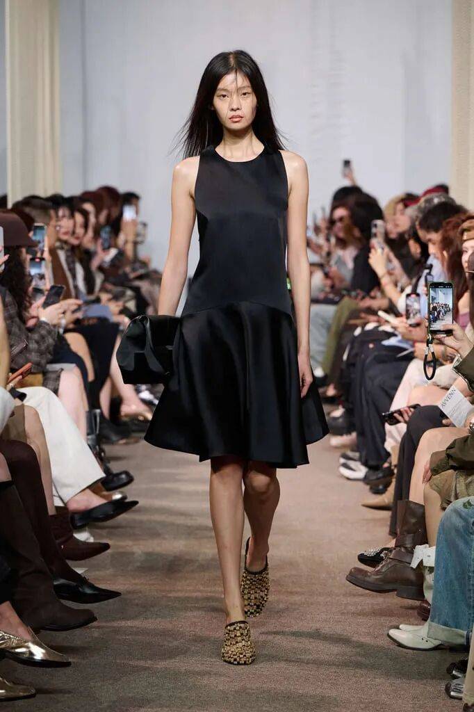 纯黑色颜色的服装在无袖的裙装中,以廓形的裙摆结合也多了一些褶皱和造型的时尚细节感。