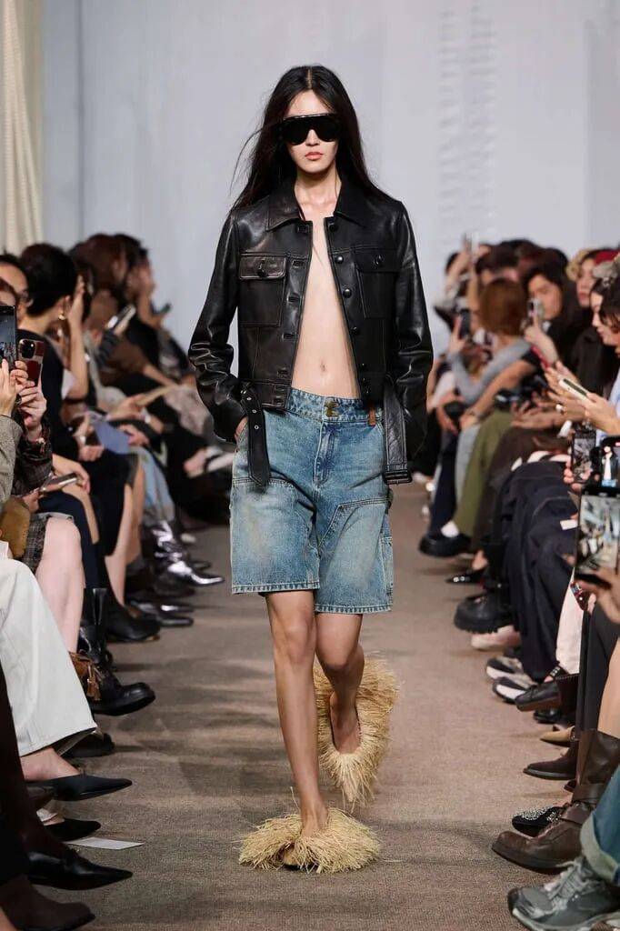 黑色皮革上衣在夹克款式中,休闲酷飒,而搭配蓝色的牛仔短裤也多了一些休闲大方的时尚感。