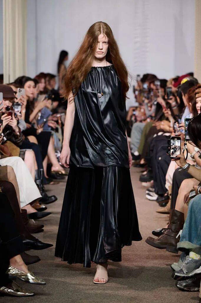 黑色颜色的服装在廓形的休闲舒适中,光滑的面料还在光泽的材质中,也多了一些面料质感和细节的随性时尚。