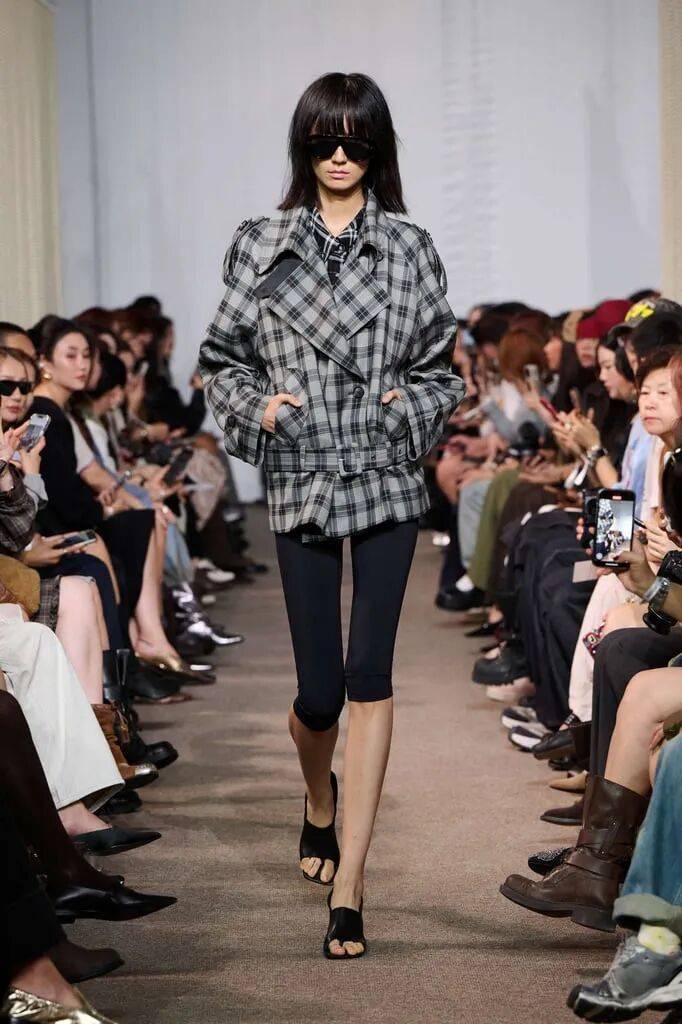 休闲上衣在廓形线条中,而低调的黑色和灰色等颜色之间的结合,色彩的对比增加了格纹图案的经典复古的气质感,搭配的黑色修身短裤则多了廓形线条的对比。