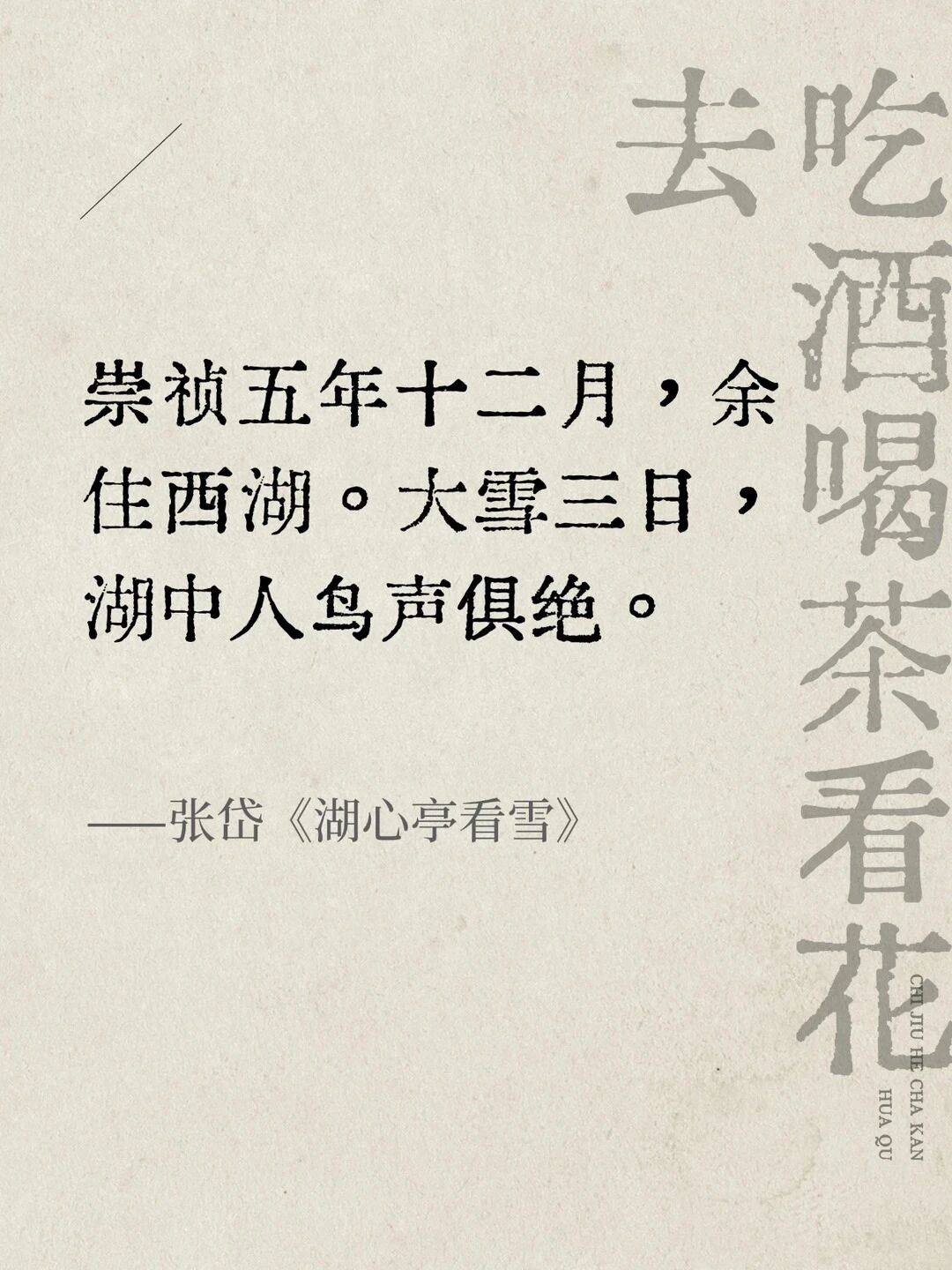 崇祯五年十二月,余住西湖。大雪三日,湖中人鸟声俱绝。