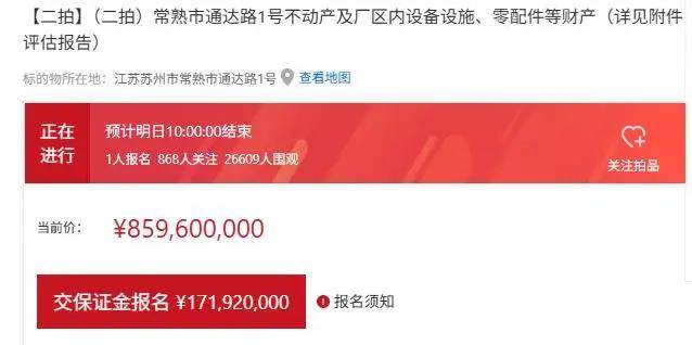 1月15日上午10点,观致汽车位于常熟市通达路1号的不动产、设备及零配件等资产被正式拍卖,起拍价8.596亿元。截至发稿,这场拍卖已吸引超2.6万人围观,868人设置关注,但仅1人报名。
