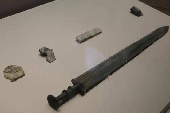 对古人来说,金玉是最为珍贵的物品之一。因此,当一个人的社会地位足够高时,他不仅要确保自己的衣着、用具符合礼法,还要展示自己的尊贵身份。所以,君子佩剑的意义并不仅仅是为了武装自己,而更多的是为了展示地位、装点风采。例如,中山靖王刘胜的佩剑就很好地展示了这一点。刘胜的佩剑出土于1968年,地点是在河北满城,目前这把剑被保存在河北博物院。乍看之下,这把剑似乎只是普通的铁剑,但仔细观察,会发现剑身的不同位置装饰着各种玉饰,这使得这把剑不再是简单的铁剑,而是变成了富有贵气的玉具剑。
