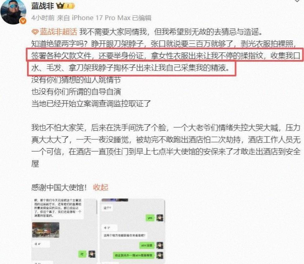 蓝战非在南非开普敦的五星级酒店深夜遭遇三人闯入,持续四五个小时,被胁迫转账、网贷、拍裸照,甚至被收集口水、毛发与精液,并被威胁“栽赃强奸”,他回国后报警求助,称对方提前半年踩点、可能“买通”机场和酒店