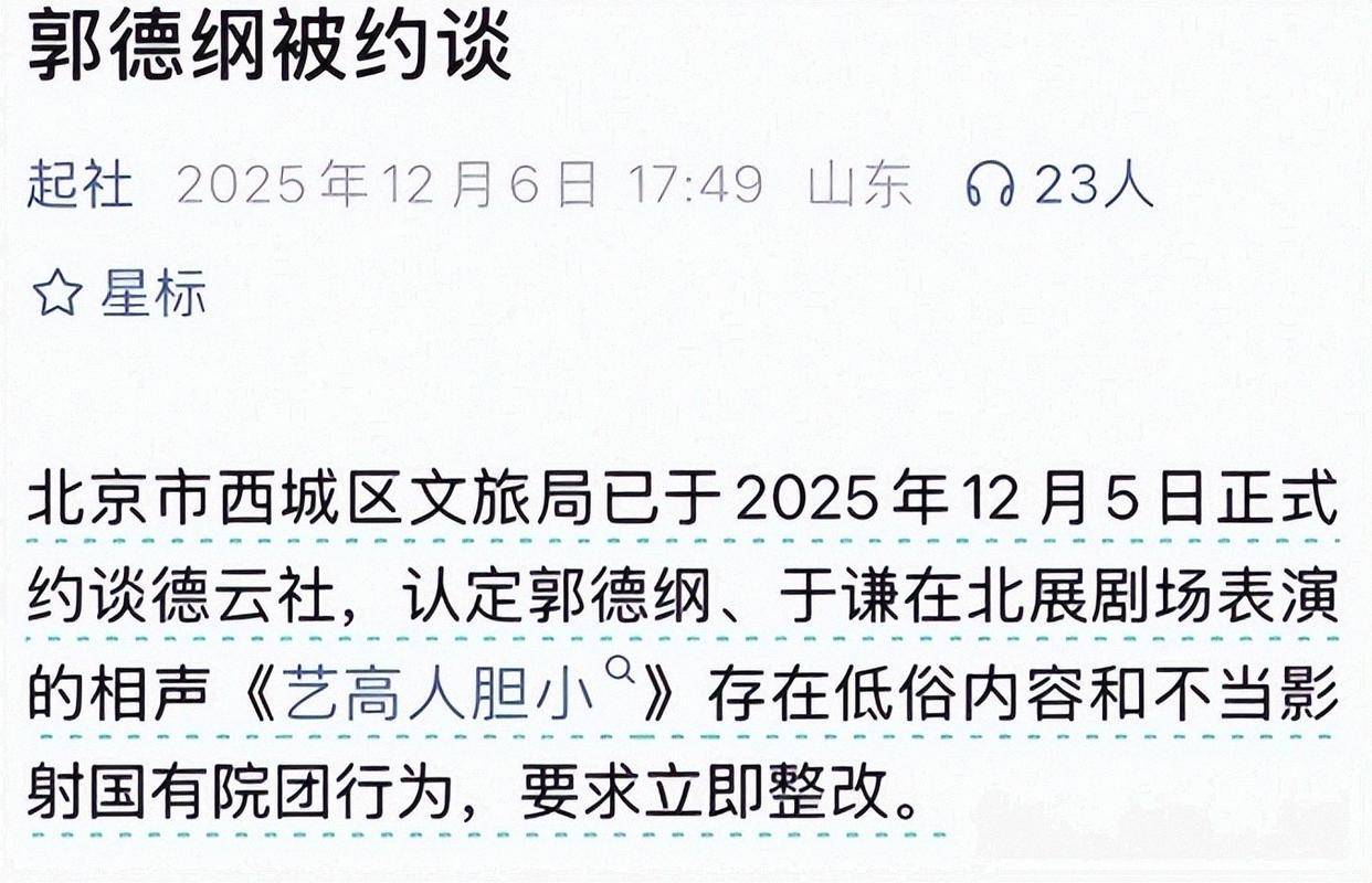 郭德纲这边,网传因相声《艺高人胆小》“低俗”被西城文旅约谈,当地回应“需等领导调度”,中国曲协也未给出明确结论;