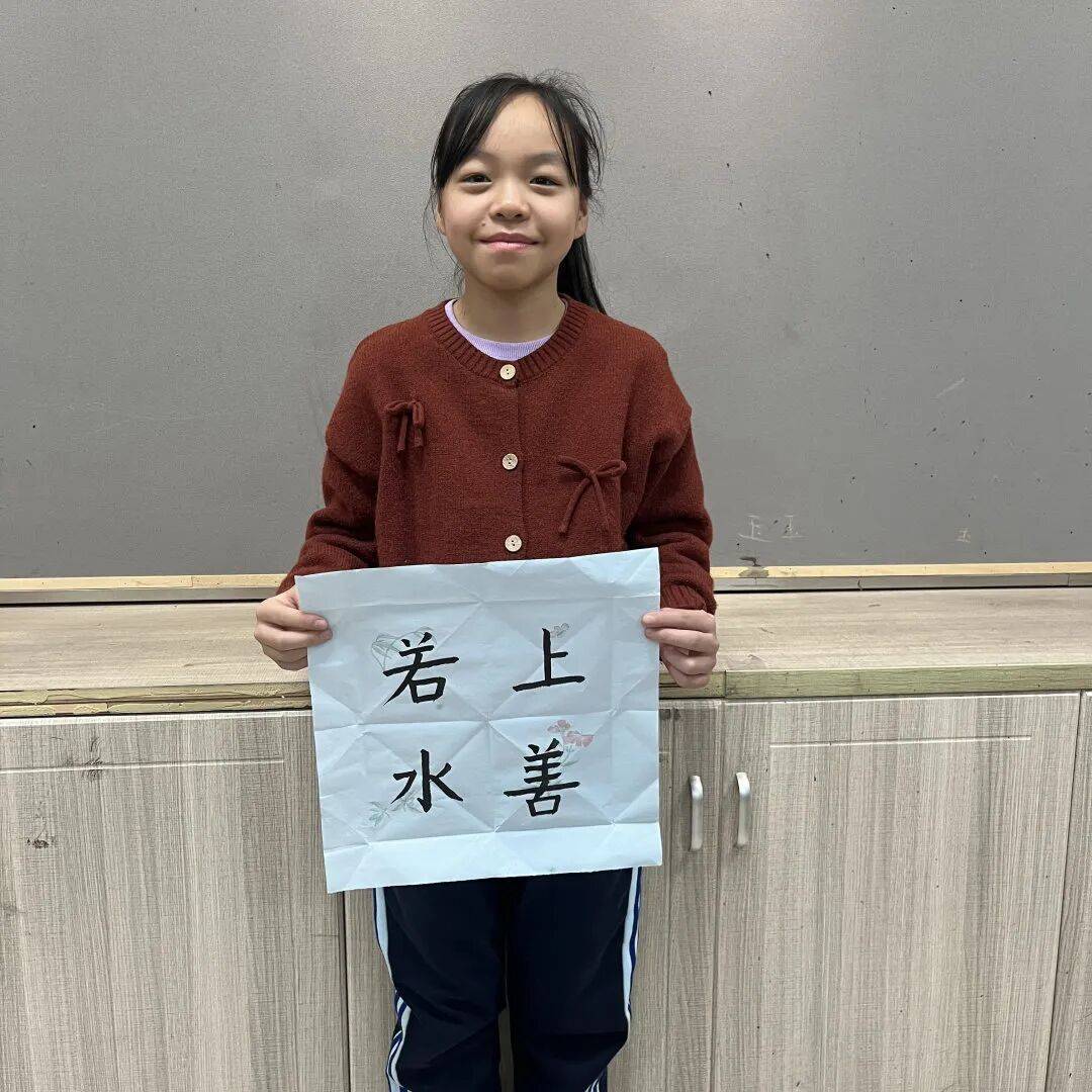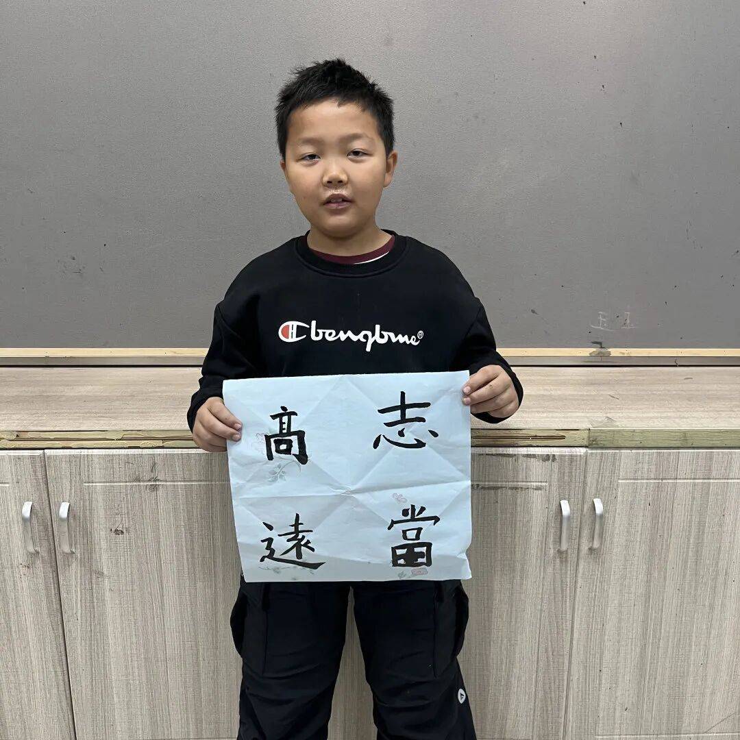 随后,老师示范起笔、行笔、收笔的精妙技法,讲解笔墨章法与字形布局的奥秘,一撇一捺间,尽展书法的形态之美。孩子们屏息凝神,有的循着老师的轨迹一丝不苟地临摹,笔下笔画沉稳如松;有的反复推敲字与字的间距,调整大小比例,只为让整幅作品更显和谐气韵。当最后一笔轻轻落下,“上善若水”“志当高远”“志在四方”等吉言在宣纸上舒展身姿——它们虽无丹青的绚烂,却以墨色的浓淡干湿,诉说着孩子们对传统文化的敬意与对未来的纯真期许。