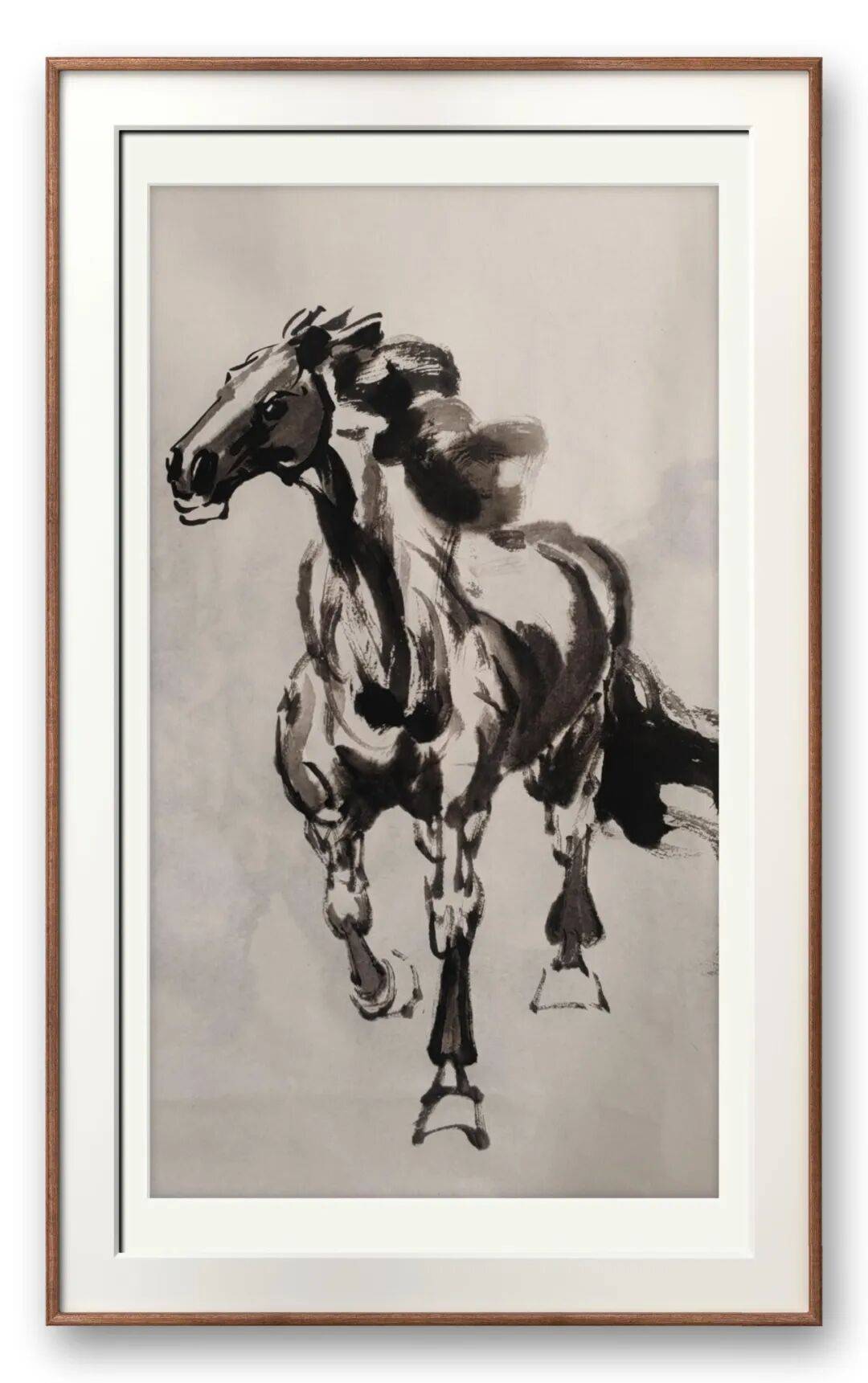 画马尽显豪迈之志。他延续奔放风格,以中锋勾线显肌肉遒劲,枯墨皴擦展鬃毛飞扬,笔下之马或凝神或奔跃,于笔墨间见磅礴气势,以马之灵动映自身襟怀,彰显东方美学的雄浑意境。