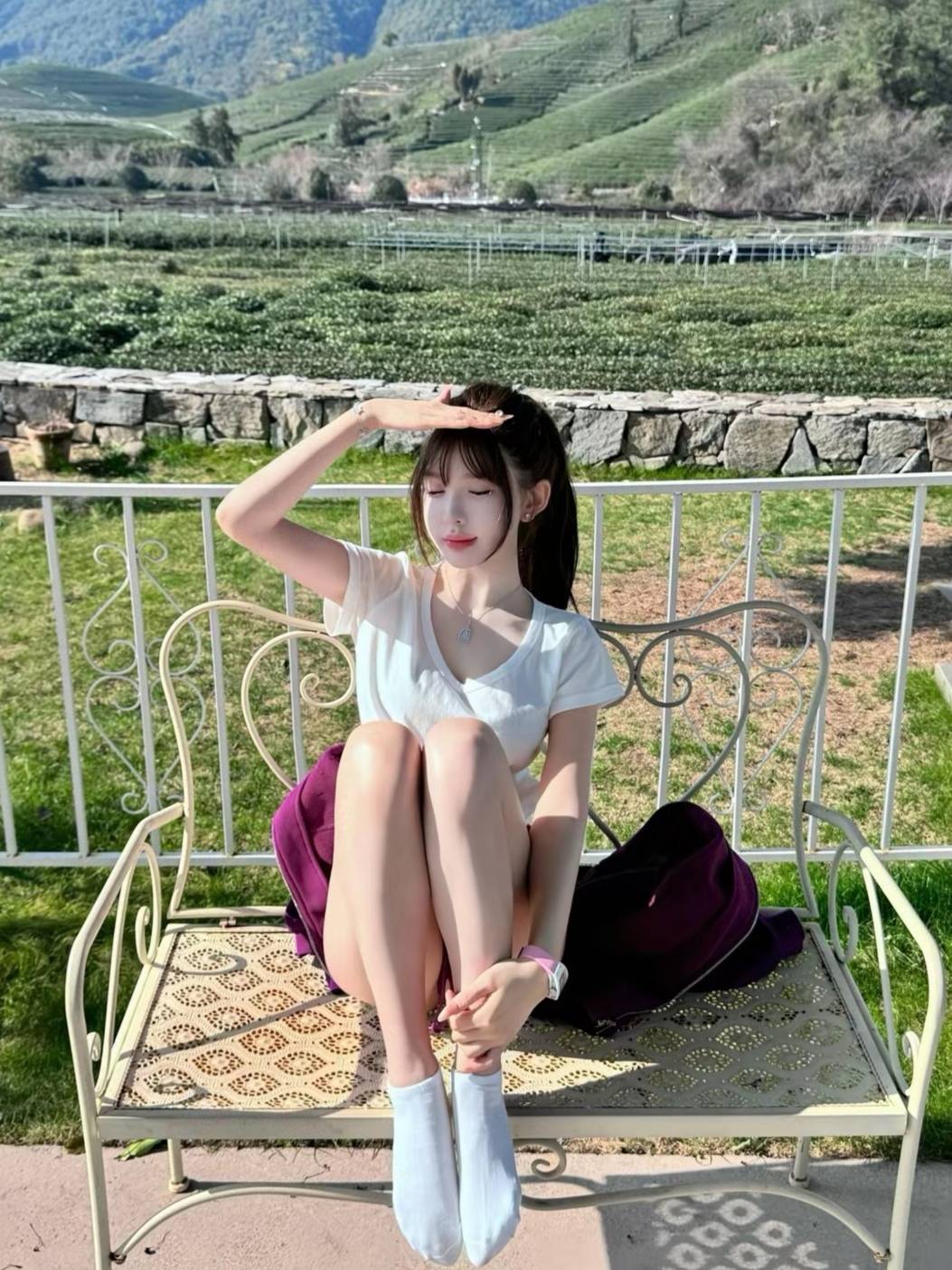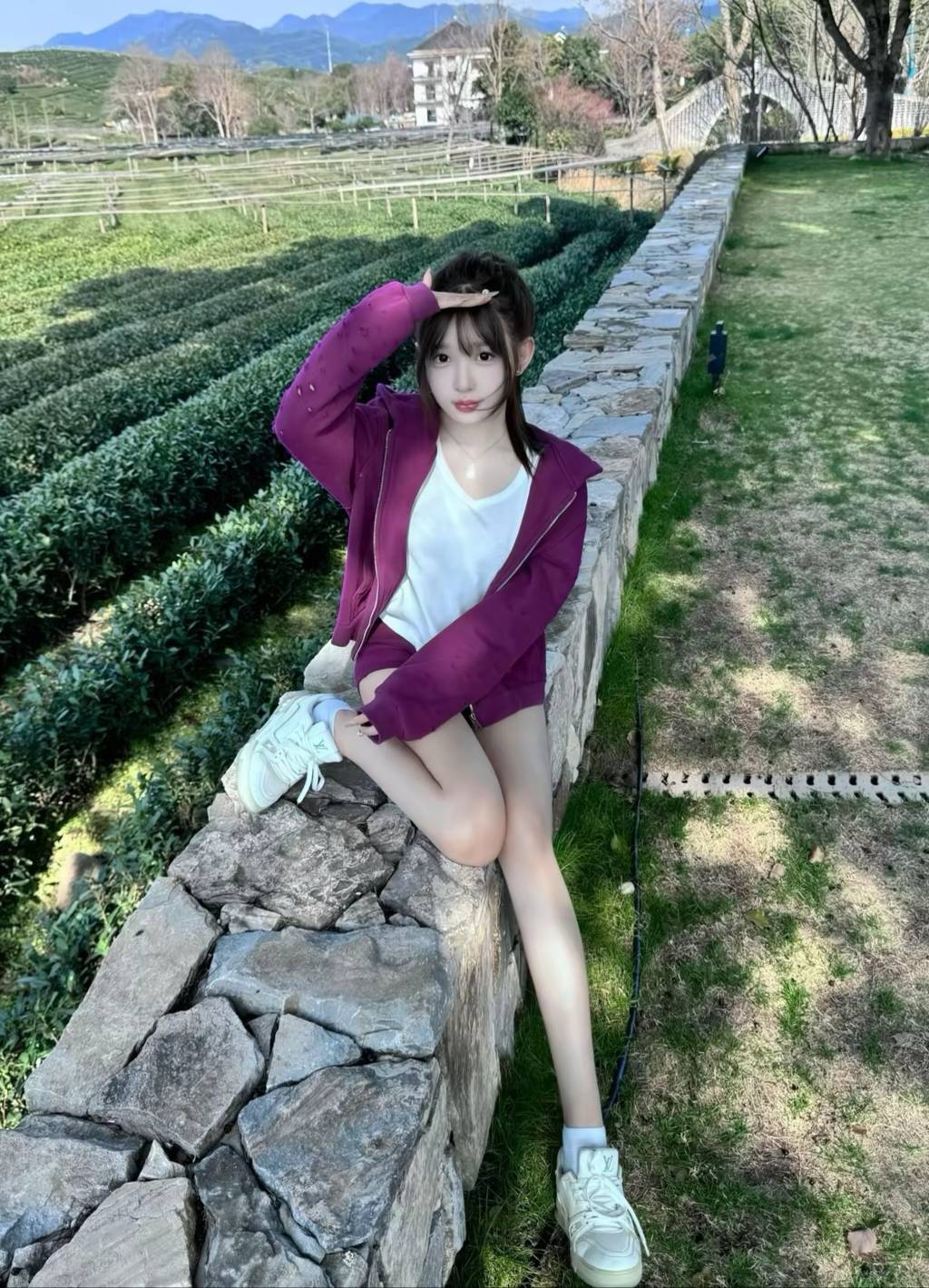 一位少女悠然置身其间。她时而端坐于镂花长椅,一袭白衣,锁骨微露,指尖轻触额角,目光宁静地望向远方,仿佛在聆听风与叶的低语。时而,她又换上俏皮的紫色短外套,单脚轻踩古朴的石墙,手扶前额,笑容里带着几分明媚的狡黠,与身后整齐的茶垄相映成趣。