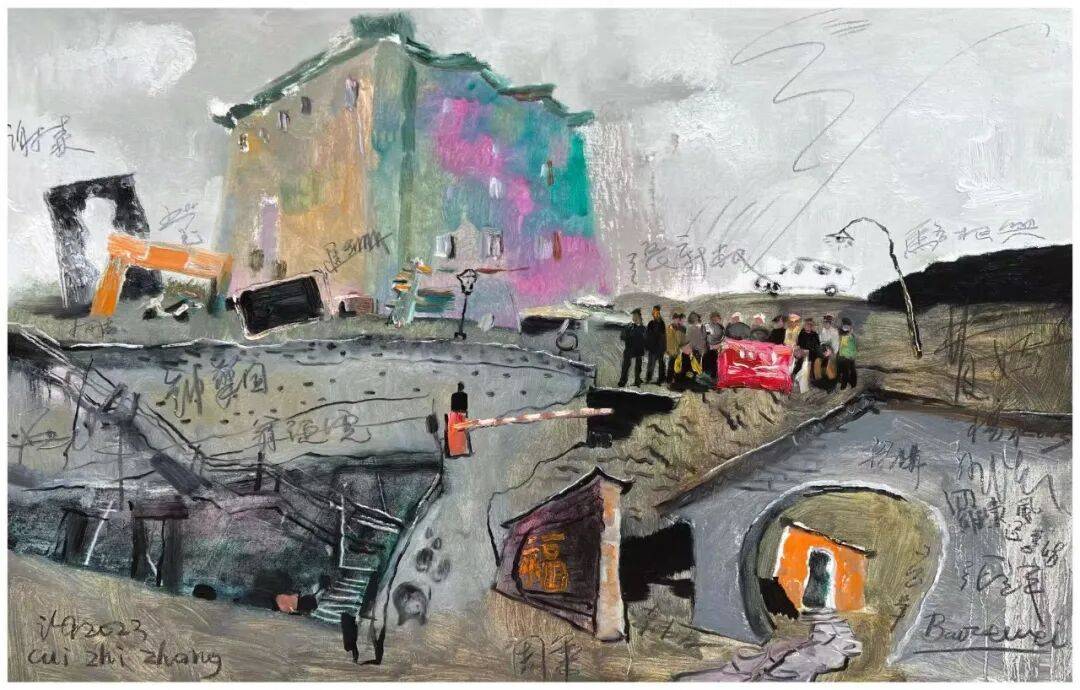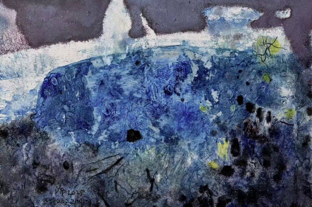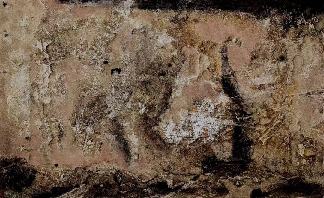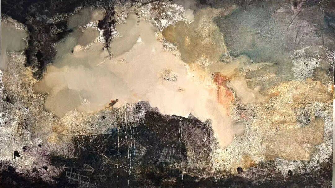 老崔的画却是汪洋姿肆,激情难掩,好象在重复人间万物的岁月留痕(沒听说物痕有“有意为之"的表技吧?!),他的每幅作品就象是他仅仅为万物留痕作了个剪裁,“不经意"中你就悟出他指向心路的"道道"。三是情温,情温真在深隐,想藏藏不住,大多画家的"情"是在表象上,如飞溅的小溪,又亮又响,老崔的情在画中藏得很深,在那杂乱如云如荆如石如雨如雾中,你能渐渐触摸到画的灵魂,如平缓而宽阔的大江一一嘿,那深博的蕴力可不是悬瀑飞流。