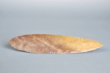 该石器为周身琢,中间厚,两侧薄,形制对称,厚薄均匀,边刃加工制作锋利,是镶嵌在骨刀梗上的石片石器,属刮削器一类。器物两面都经过两次“压制法”的修理。
