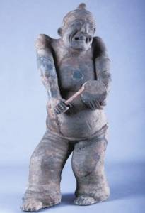 现藏于四川博物院的东汉陶说唱俑属国家一级文物,高66.5厘米,于1963年出土于四川省郫县宋家林砖室墓。陶俑头顶椎髻,双目微闭,歪嘴吐舌,表情生动。两臂上耸,左臂佩戴环饰;左手托小鼓,右手执槌作敲击状。俑像上身赤裸,双乳垂至腰际,腹部圆鼓,臀部后翘。宽肥的长裤垂落至臀,似有继续下落之势。