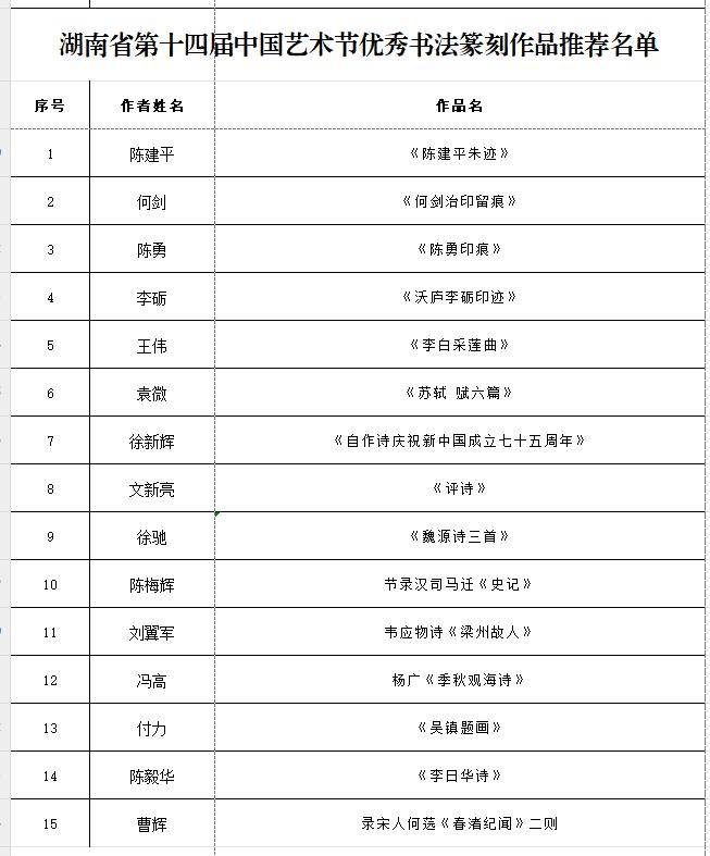 根据《文化和旅游部办公厅关于印发第十四届中国艺术节全国优秀美术作品、书法篆刻作品、摄影作品展览有关工作方案的通知》要求,经各市州、有关文化艺术单位推荐,湖南省文化和旅游厅组织评审,拟推荐美术作品14件、书法篆刻作品15件、摄影作品14件参加第十四届中国艺术节展览。现将推荐作品信息予以公示,公示时间2025年8月6日至8日。