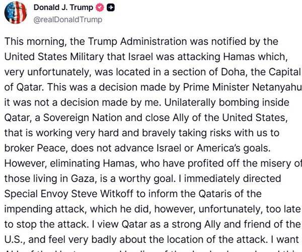 美国总统特朗普表示,这不是他的决定,他曾向卡塔尔通报即将发生的袭击,但未能阻止袭击发生。卡塔尔外交部发言人安萨里在社交媒体上表示,这一袭击是“犯罪行为”,公然违反国际法。